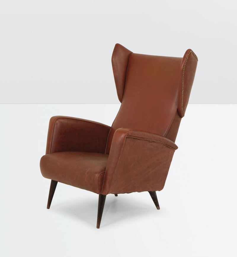 Poltrona con struttura in legno e rivestimento in skai. Disegno originale per gli arredi dell'Hotel Royal di Napoli.