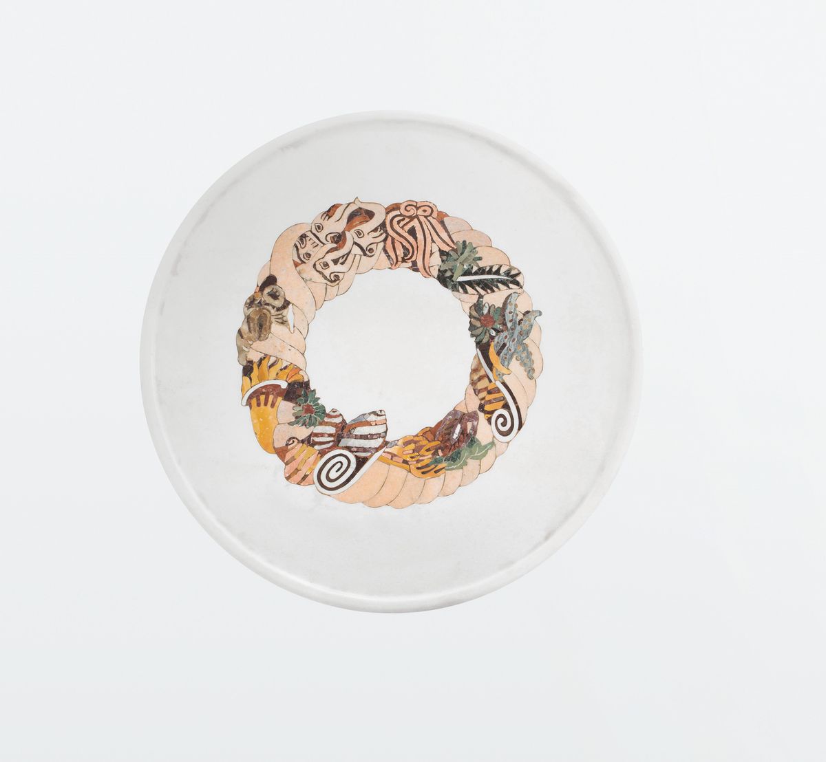Tavolino circolare con piano in Candoglia decorato con intarsi di marmi policromi e gambe in palissandro.