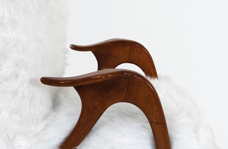 Coppia di poltrone e poggiapiedi con struttura in legno e rivestimento in tessuto.