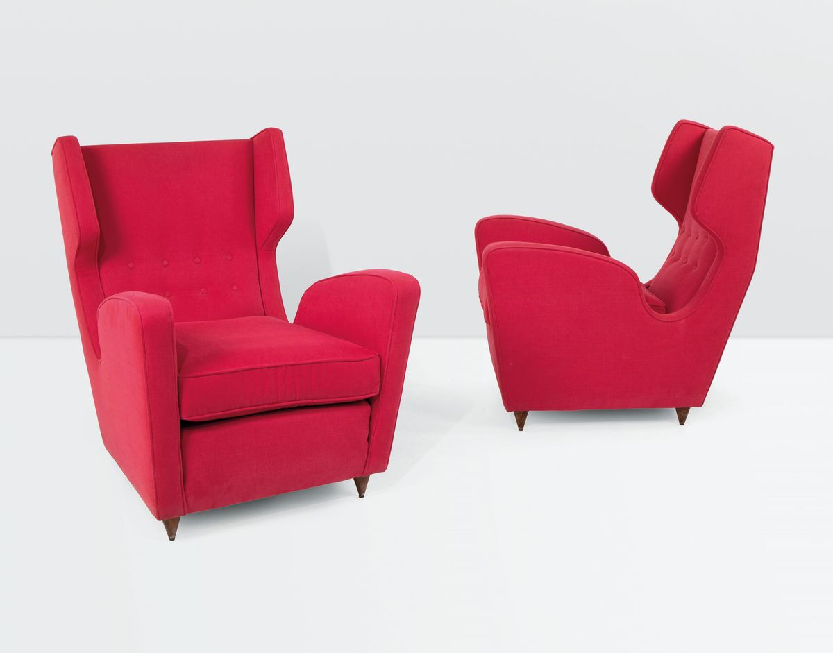 Coppia di poltrone con struttura in legno e rivestimenti in tessuto.