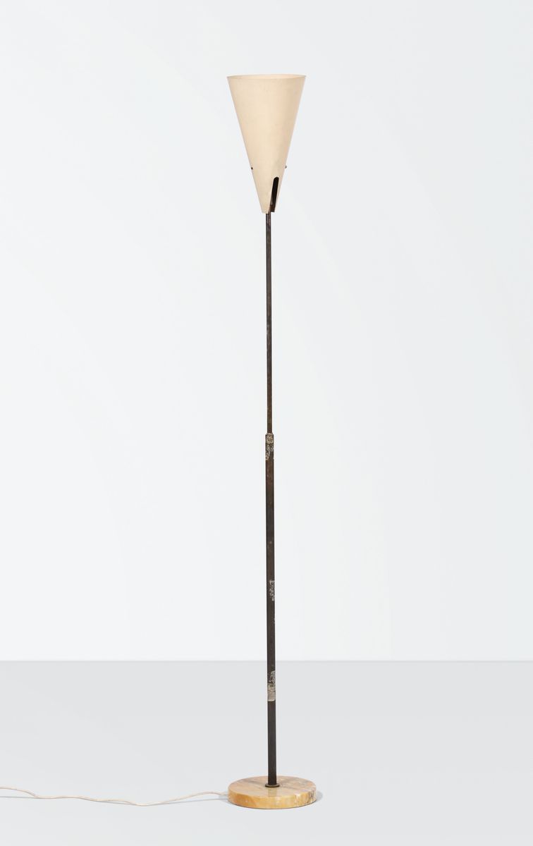 Lampada da terra con struttura in ottone e diffusore in alluminio laccato. Base in marmo.