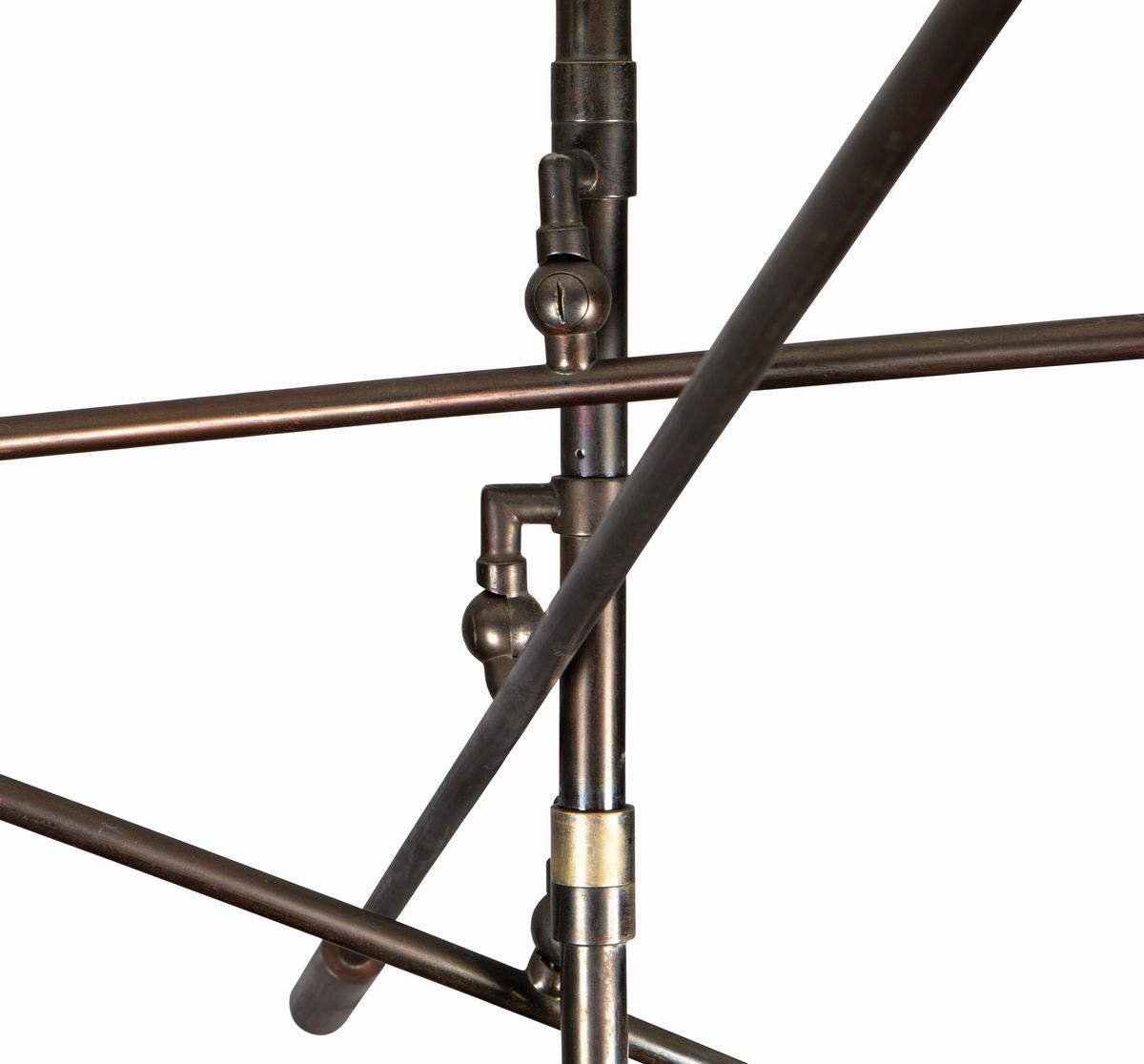 Raro lampadario con bracci estensibili ed orientabili in ottone. Riflettori in metallo laccato.