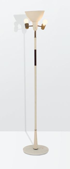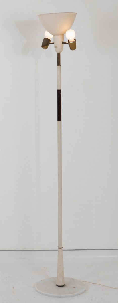 Lampada da terra con struttura in ottone e metallo laccato. Base in marmo. Decalcomania originale.