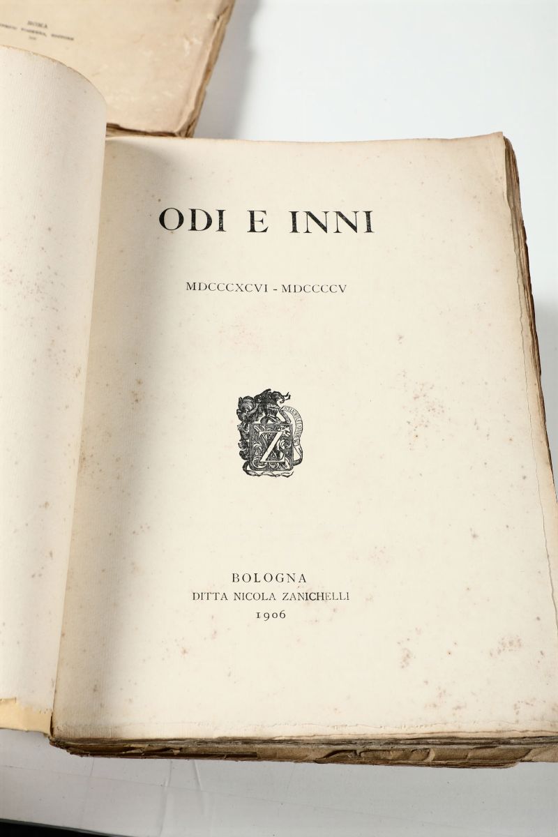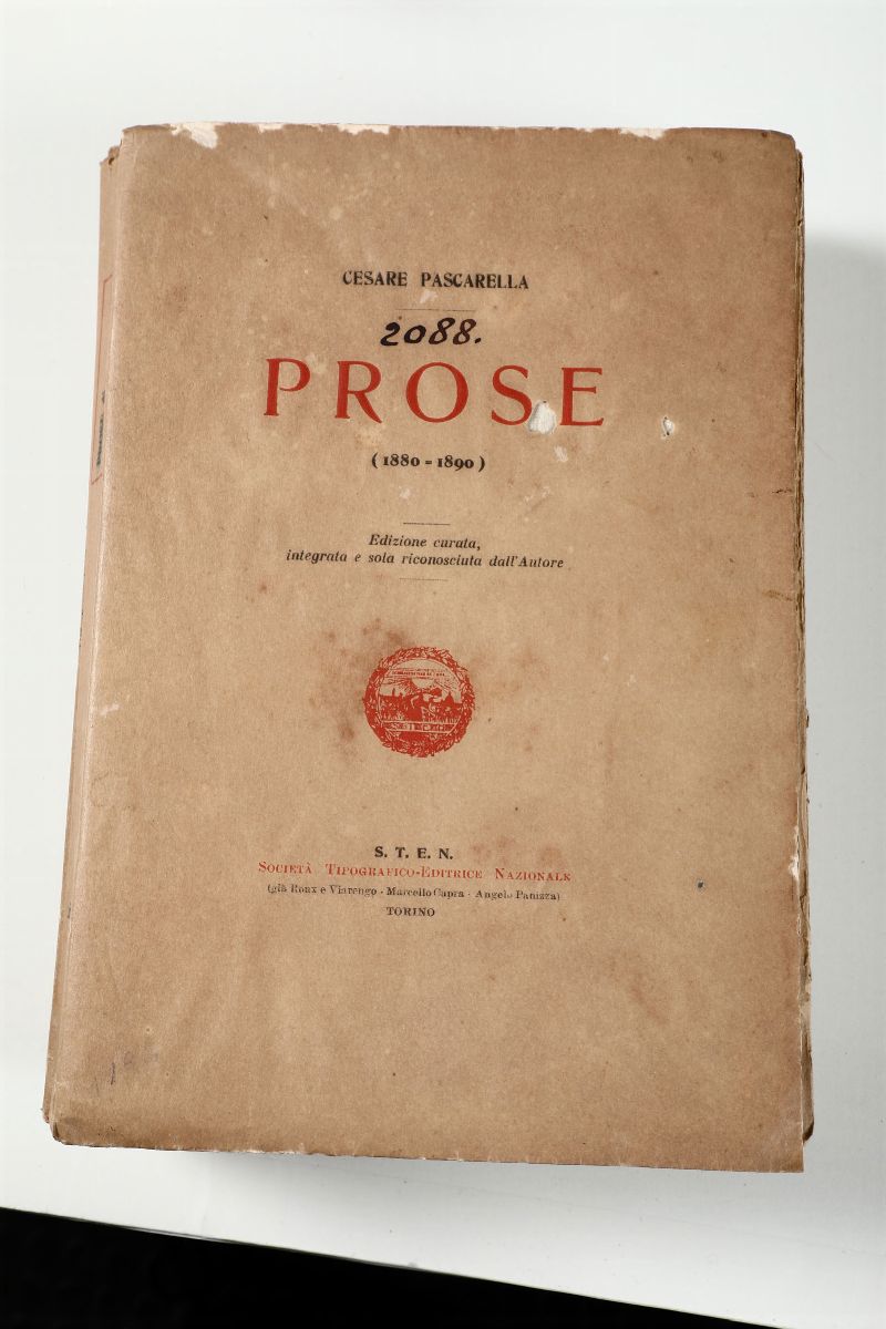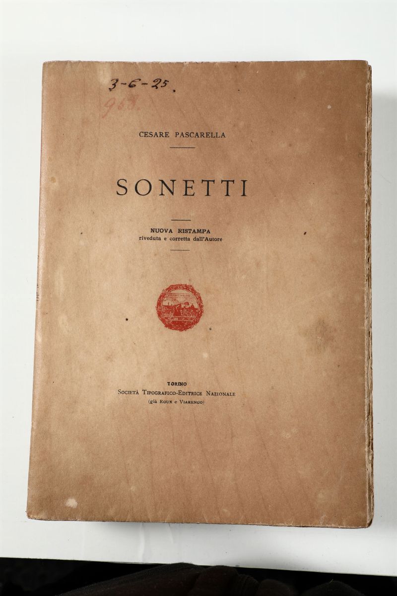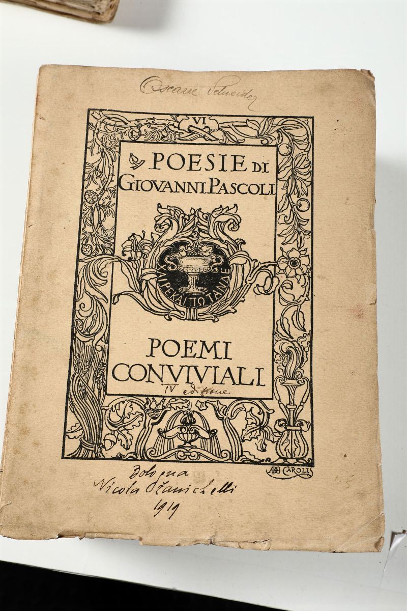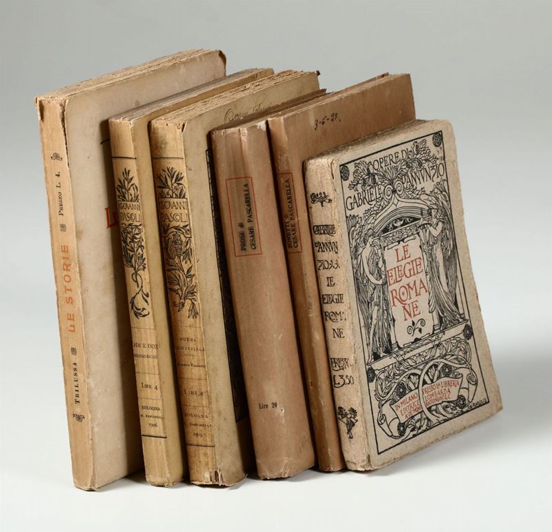 Pascarella prose 1920+Pascarella sonetti 1907+ D'Annunzio Elegie romane 1905 + Trilussa Le storie 1913 + Pascoli Odii e Inni 1906 + Pascoli Poemi conviviali 1905?(Mancante del frontespizio con dedica dedica a De Bosis).
