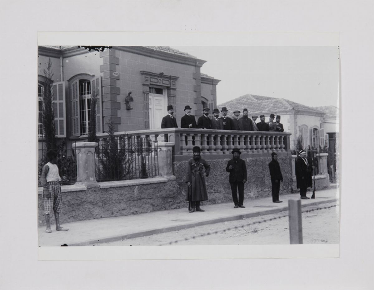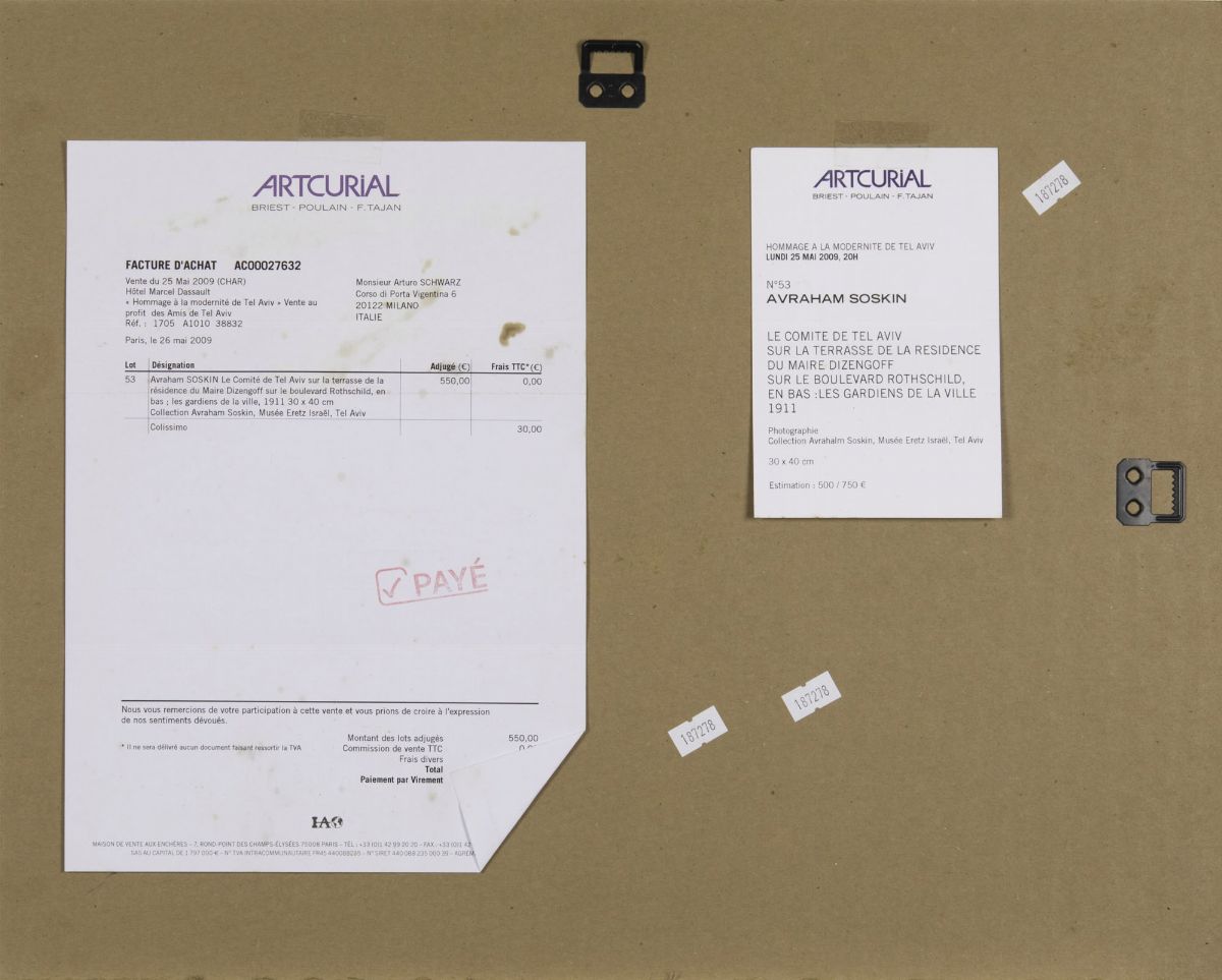 Le comite de Tel Aviv sur la terrasse de la residence du maire dizengoff sur le boulvard Rothchild, en bas: Les gardiens del la ville, fotografia in bianco e nero, cm 30x40 Collection Avrahalm Soskin, Musée Eretz Israel, Tel Aviv
