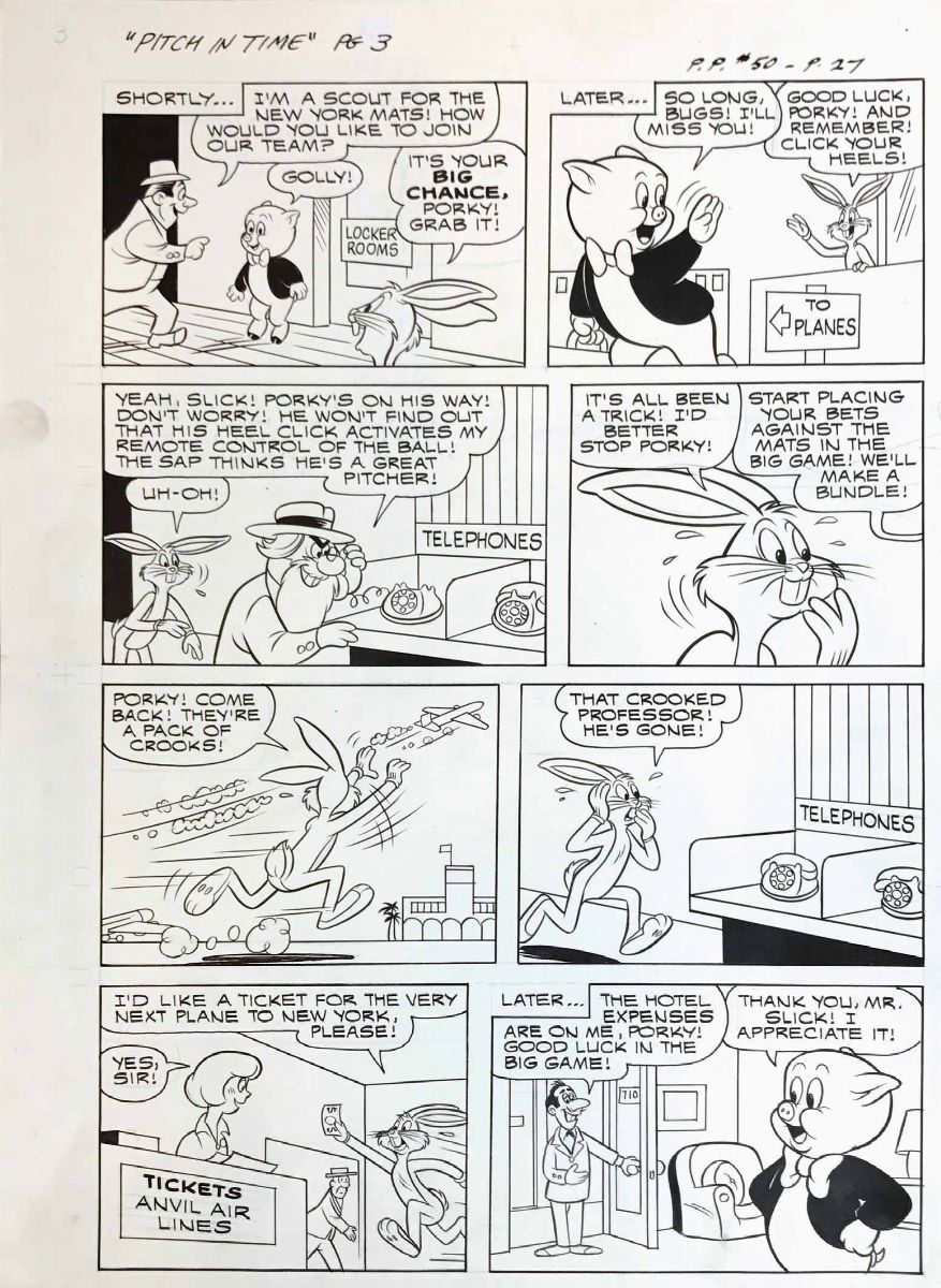 3a tavola per la storia edita in “Porky Pig” #50 a pag. 27, edizioni Gold Key, 1965. Matita, china e matita blu su cartoncino, cm 36x49.