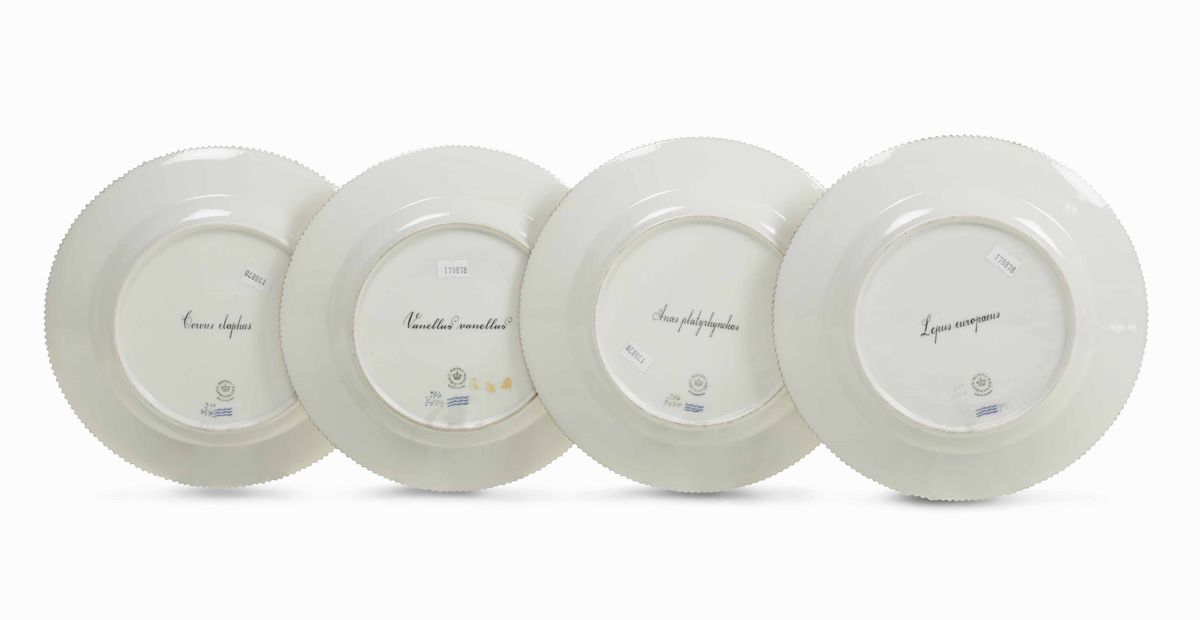 Dal servizio Flora Danica sono dipinti con la variante della selvaggina. Sul verso, in caratteri latini in nero, i nomi degli animali raffigurati
