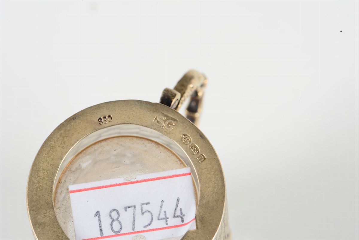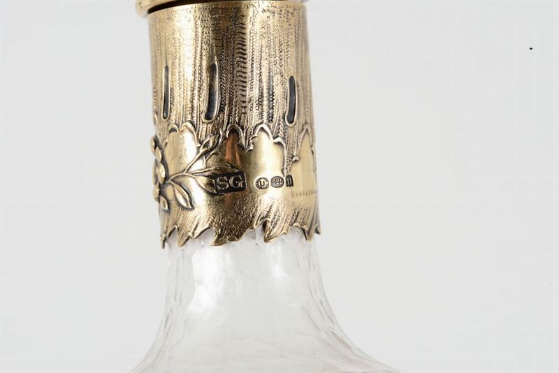 Servizio da rosolio composto da tre bottiglie e dieci bicchieri in vetro molato e argento dorato. Argenteria inglese d'importazione [..]