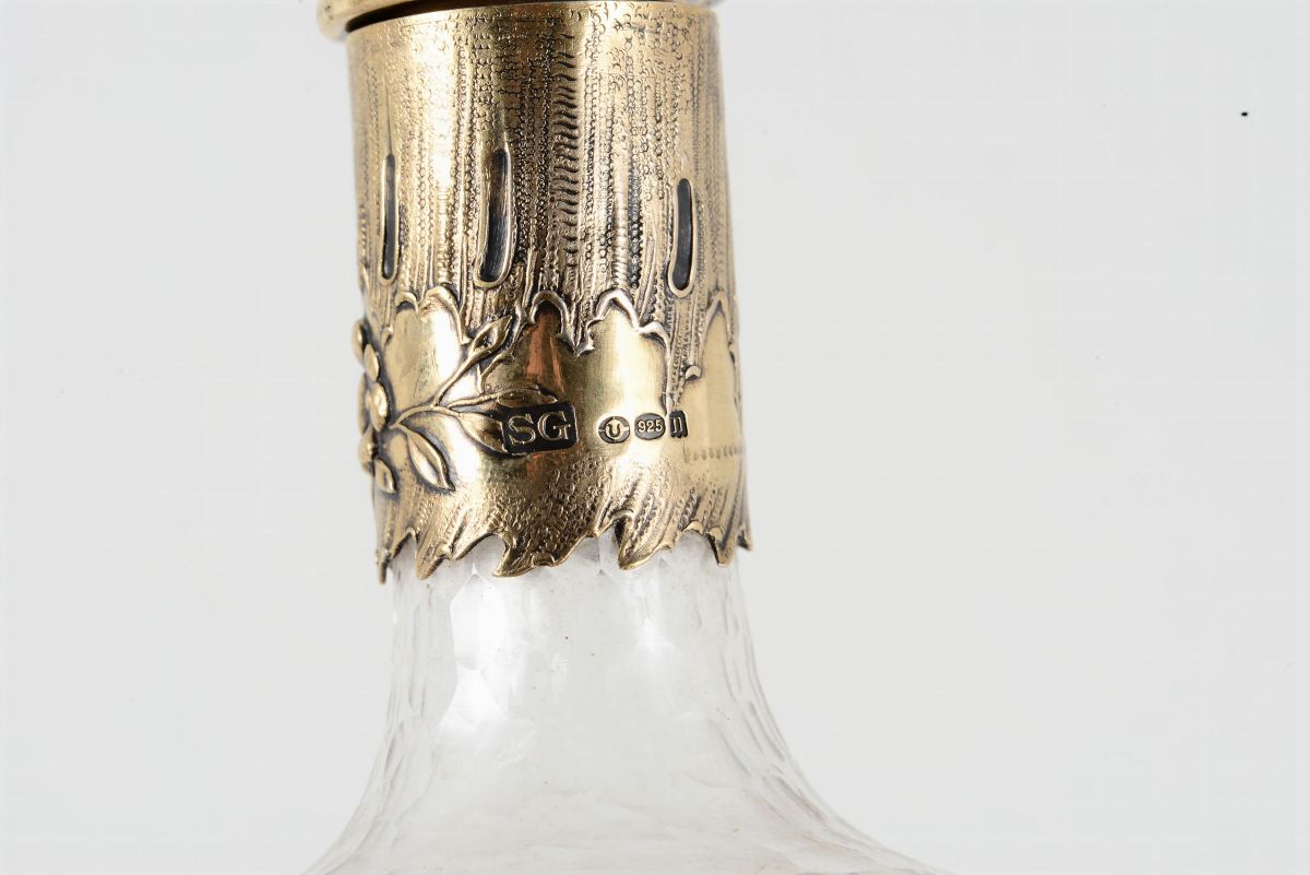 Servizio da rosolio composto da tre bottiglie e dieci bicchieri in vetro molato e argento dorato. Argenteria inglese d'importazione XX secolo