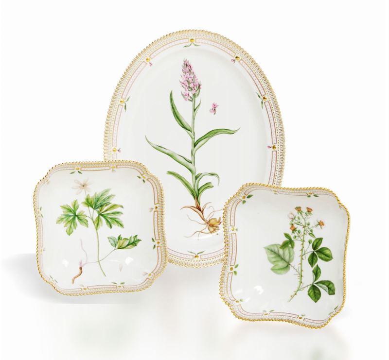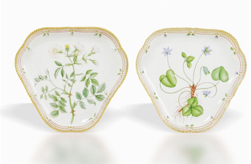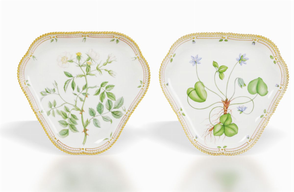 Un piatto ovale, due bacinelle quadrate, due bacinelle triangolari e due vassoietti con manico Danimarca,manifattura Royal [..]