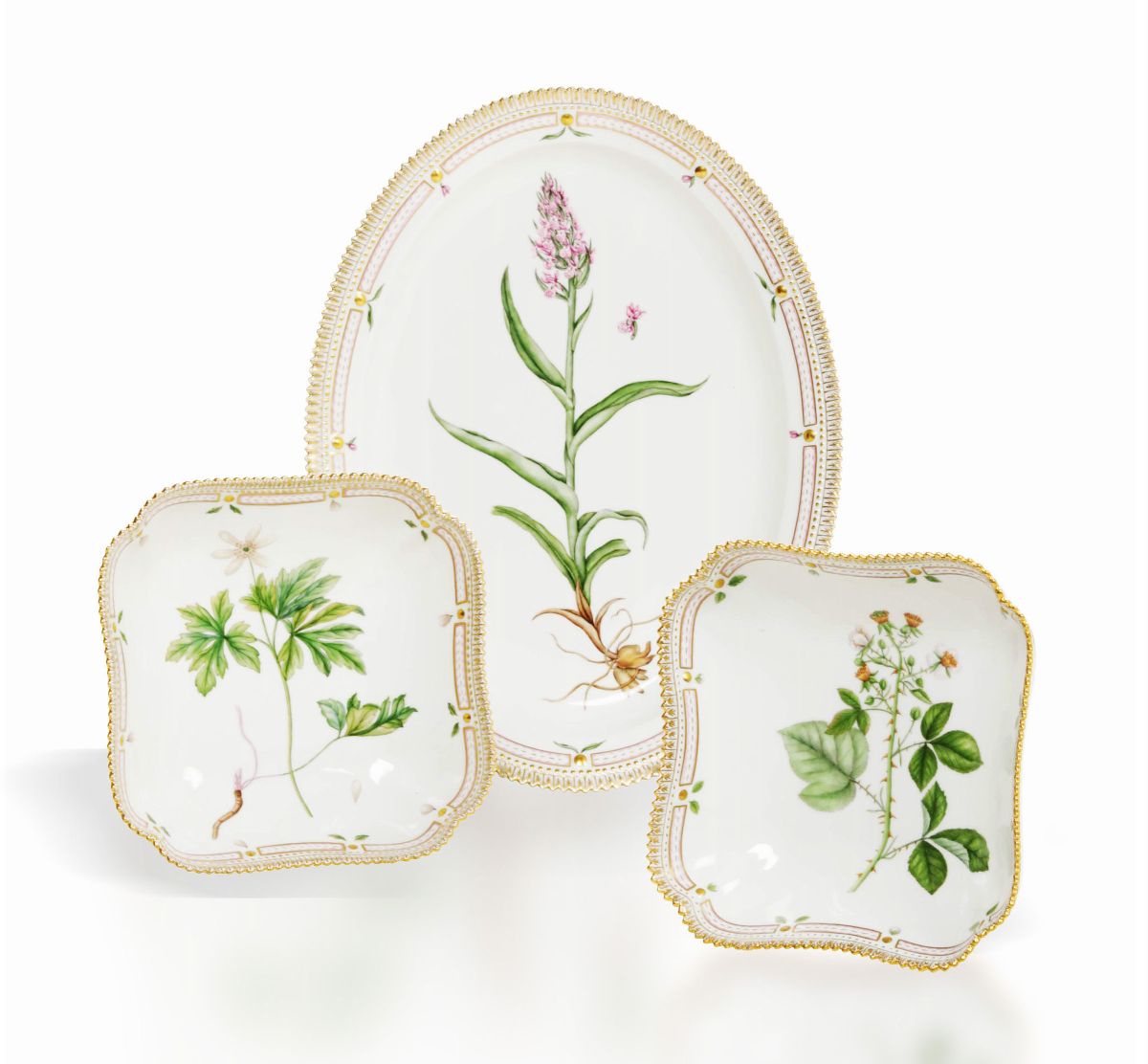 Dal servizio Flora Danica sono dipinti con diverse specie botaniche. Sul verso, in caratteri latini in nero, i nomi delle piante raffigurate