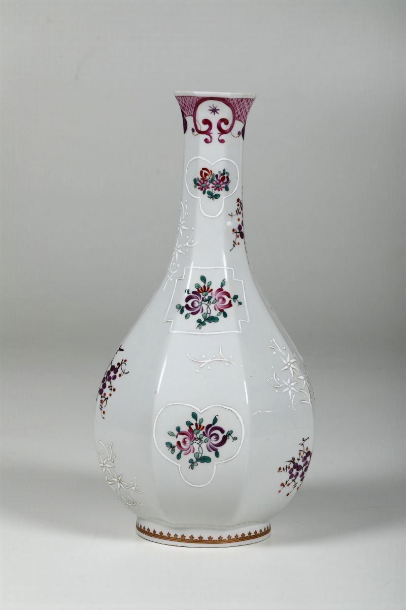 La bottiglia a sezione ottagonale è decorata in policromia, alla maniera della Compagnia delle Indie, con un grande stemma araldico sostenuto da due grifoni e da ramoscelli fioriti sparsi. Inoltre ramoscelli fioriti bianchi in rilevo