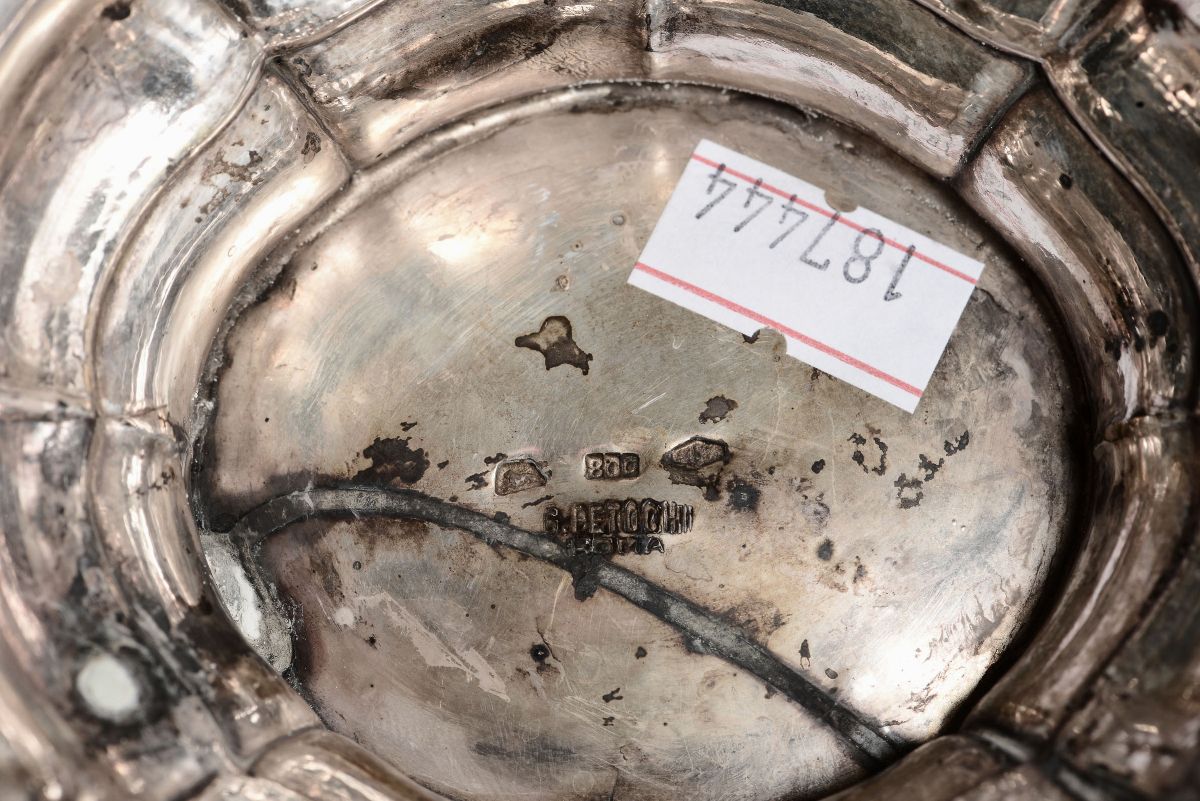 corpo piriforme costolato nei modi dell’argenteria settecentesca. L'opera riprende il modello di una caffettiera prodotta nello Stato Pontificio (Macerata) nella seconda metà del XVIII secolo. Già nella collezione Falanga di Milano; vedi: - Catalogo mostra argenti italiani dal XVI al XVIII secolo Museo Poldi Pezzoli, Milano 1959,tav.73
