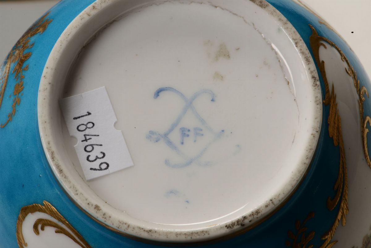 Porcellana. Marca: due “L” incrociate con lettere data “FF” per 1783 in blu. Altezza caraffa cm 19; altezza bacile cm 7,8; 26,2 x 21. Perfetto stato di conservazione