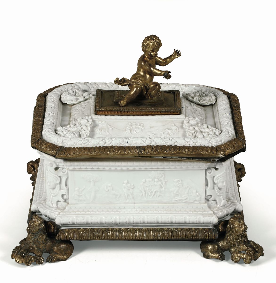La cassetta in porcellana è delimitata, sia superiormente che inferiormente, da diversi ordini di cornici e, sia le pareti che il coperchio, sono a bassorilievo istoriato con scene mitologiche. Ai quattro spigoli un cartiglio incornicia una testa femminile. Il coperchio in porcellana, molto elaborato, presenta inoltre una cornice con corona di foglie e frutti e agli angoli quattro fregi con elementi vegetali