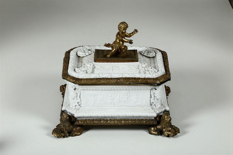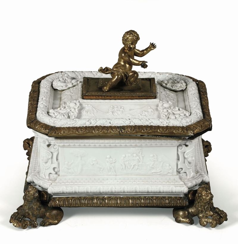 Il cofanetto poggia su una base in bronzo dorato decorata a palmette e sorretta da quattro leoni. L’importante presa del coperchio, a forma di putto a tutto tondo, è pure in bronzo e nasconde un vano segreto