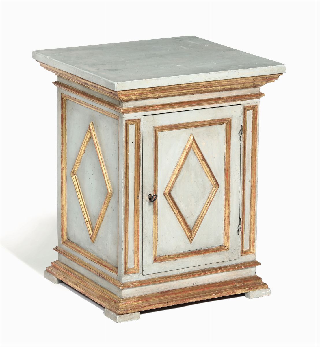 Comodino ad un'anta in legno intagliato, laccato e dorato, XVIII secolo
