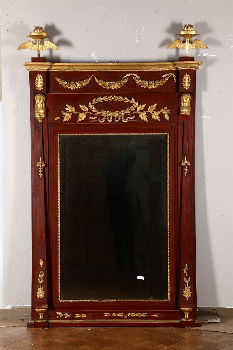 Console Impero con alta specchiera in legno dipinto e dorato, XIX secolo