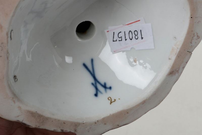 Porcellana policroma. Marca: spade incrociate in blu; numero “1130” inciso. Altezza cm 19,5. Una bobèche con vecchio restauro, sbeccature e restauri minori