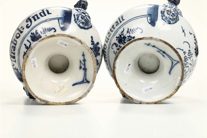Su alto piede hanno corpo rigonfio con, sulla spalla, due protomi animali su mascheroni, basso collo e bocca con ghiera. La decorazione, in monocromia blu, è a rami fogliati e fioriti e con fasce apotecarie con le iscrizioni “Ermo dattali” e “Mirabol: Indi”