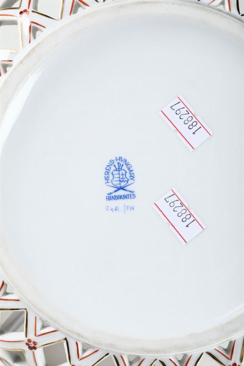 1 alzatina traforata. Manifattura di Herend, seconda metà del XX secolo. Marca: “Herend Hungary Handpainted” con scudo e “Candida Tupini Roma” in blu. Altezza cm 20; 29 x 22. Una felatura sotto la base