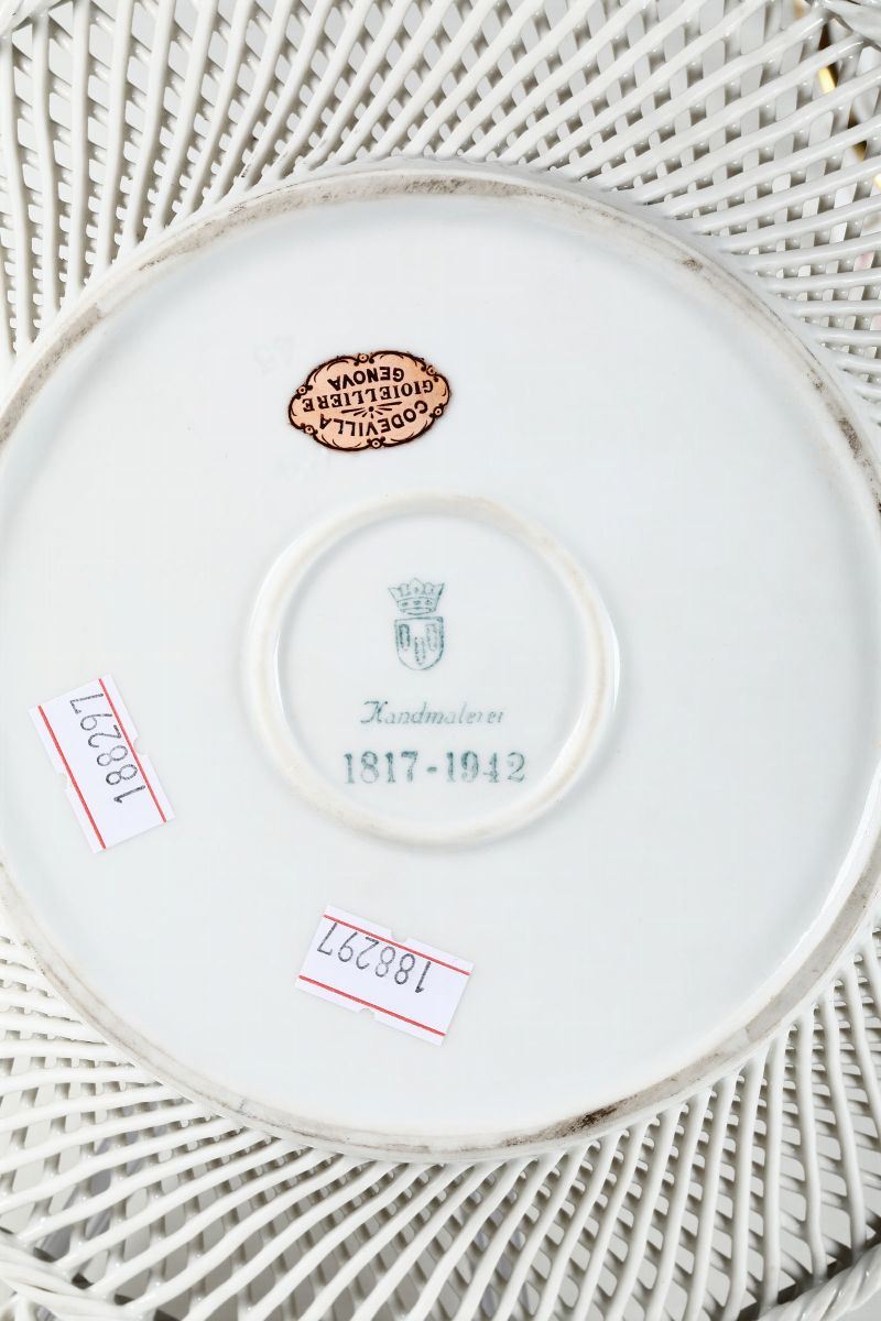 1 cestina traforata. Manifattura di Plaue (Turingia), prima metà del XX secolo. Marca: scudo con tre foglie e corona, “Handmalerei 1817-1942”. Altezza cm 4,8; diam. cm 24,8. Perfetto stato di conservazione