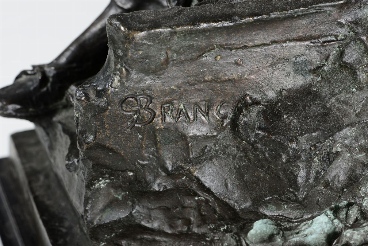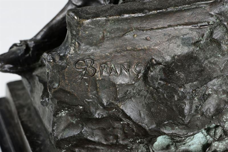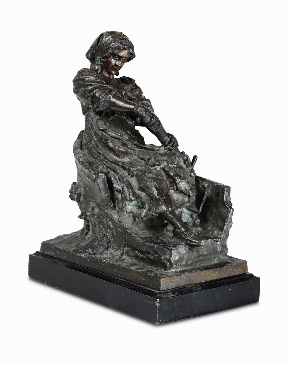 Scultura in bronzo raffigurante donna su un barca a remi, cm 32,5x28,5x42