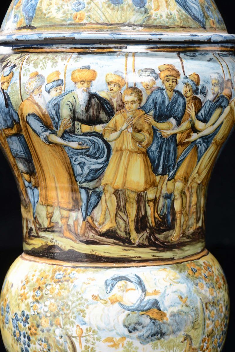 Dal corpo “a balaustro” su alto piede rastremato ha il coperchio a cupola. La decorazione si sviluppa su fasce orizzontali. Nella fascia superiore è rappresentata la storia di “Giuseppe venduto ai mercanti Ismaeliti” (GEN.,cap.37), come riportato nel cartiglio. La fascia centrale ospita, in un medaglione, Dio che dà la vita al mondo animale e vegetale, mentre nel medaglione opposto è raffigurato “Il roveto ardente” (GEN., cap. 3). Sul coperchio troviamo putti alati fra alberi, cesti e corone di fiori e foglie, inoltre piccole e grandi farfalle in volo