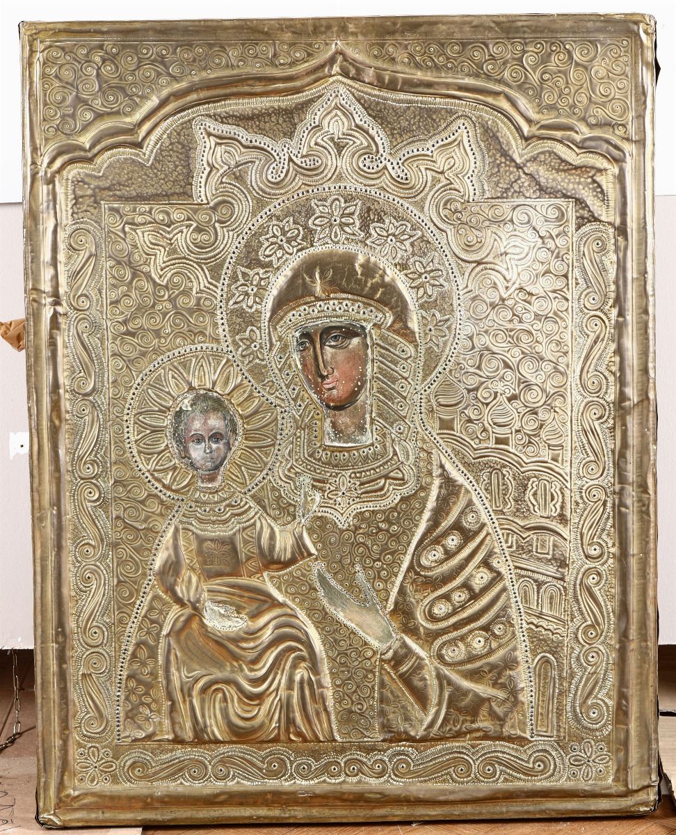 Icona raffigurante Madonna con Bambino con riza in argento, XIX secolo