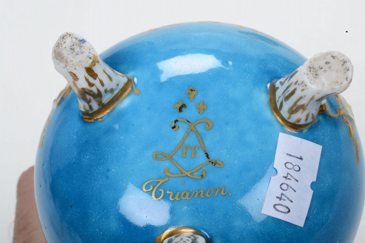 Porcellana. Marche: apocrife di Sèvres con due “L” incrociate con lettere; inoltre sotto la lattiera “Trianon” e tre gigli. Lattiera altezza cm 11,4; zuccheriera altezza cm 9,4. Lattiera in perfetto stato; zuccheriera con vecchio restauro al bordo del coperchio