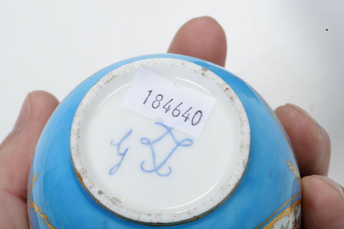 Sul fondo celeste sono risparmiate delle riserve, incorniciate a rocailles in oro, con uccelli sulla lattiera e ghirlande di fiori sulla zuccheriera