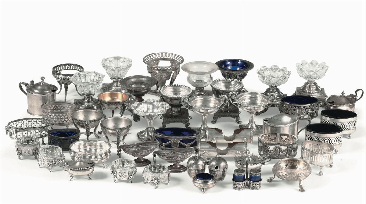 Lotto di 43 saliere in argento, varie epoche e manifatture, XIX e XX secolo
