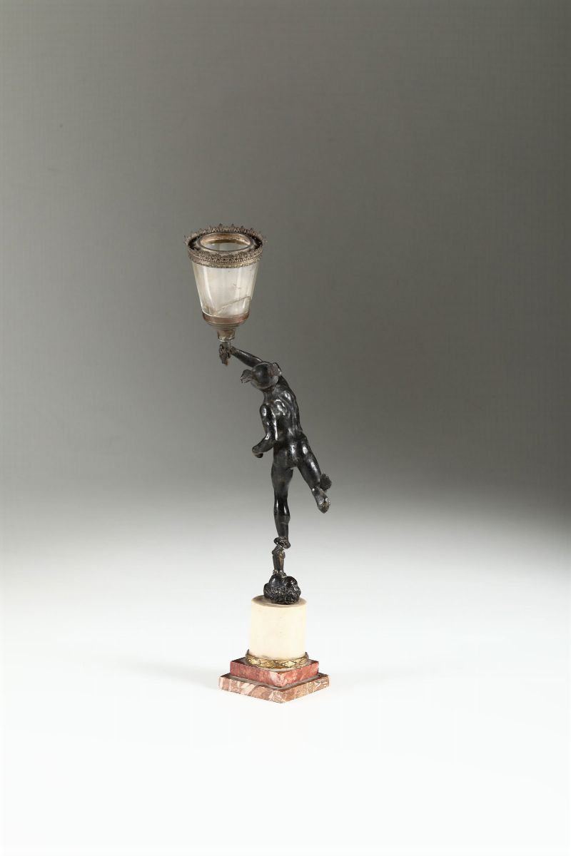 Mercurio in bronzo fuso, cesellato e patinato con base in marmi colorati e bronzo dorato, arte neoclassica Italiana (Roma) [..]