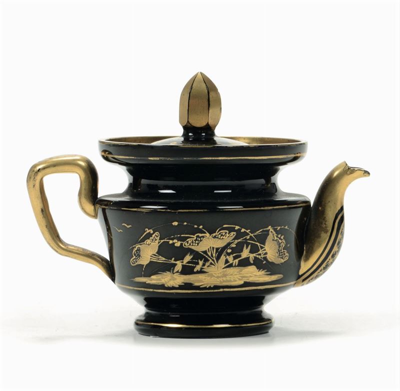 Piccola teiera vetro lattimo nero a decoro dorato, XIX secolo