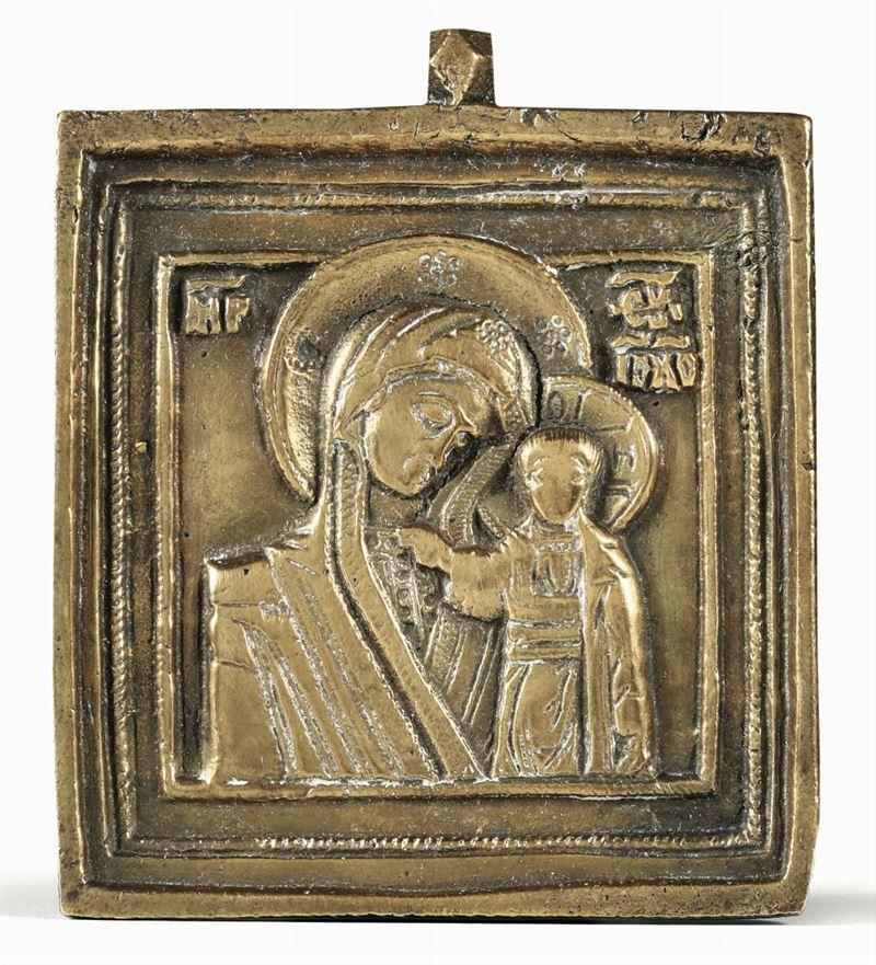 Placca in metallo dorato raffigurante Madonna con il Bambino, Russia? XIX-XX secolo