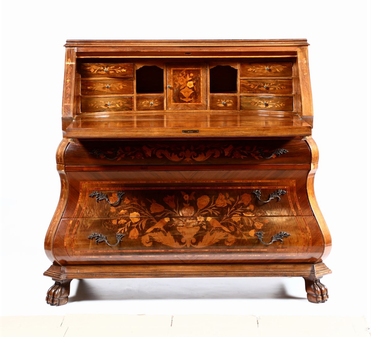 ricchi decori a motivo floreale, fronte e fianchi mossi, tre cassetti sotto la calatoia celante cassettini e vani portadocumenti, cm 129x60x116