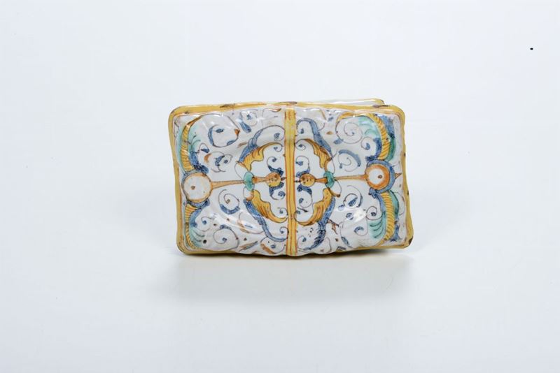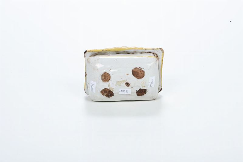 Maiolica. Altezza cm 7,2; 14,5 x 9,5. Piedini mancanti, piccole sbeccature
