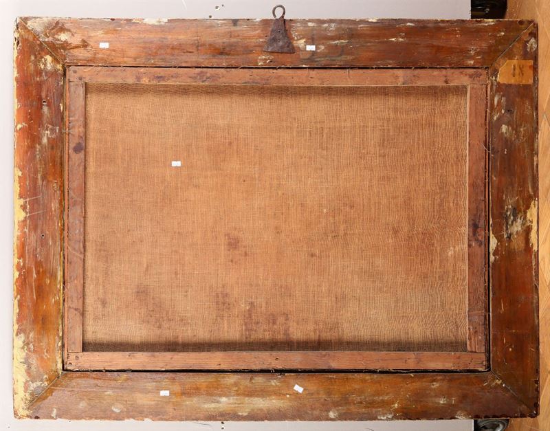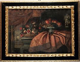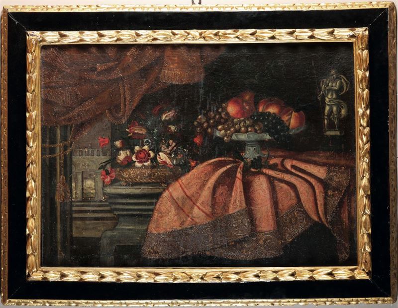 Scuola dell'Italia centrale del XVII secolo Natura morta con drappi, frutta e fiori