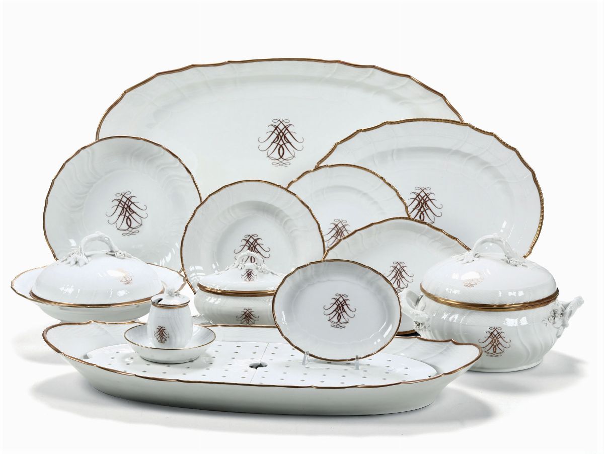 Il servizio è così composto: 15 piatti piani, 13 piatti fondi, 1 zuppiera con coperchio, 1 salsiera ovale con coperchio, 1 mostardiera, 1 legumiera con coperchio, 1 piatto da portata tondo, 6 piatti da portata ovali ( 3 grandi e 3 piccoli), 1 salsiera senza coperchio