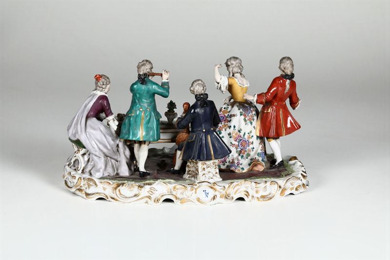 Un grande gruppo riproduce un piccolo concerto da camera con cinque personaggi di ispirazione settecentesca (alt. cm 24; 45 x 24). Due figurine raffigurano due putti; altre due un giovane pastore con il suo cane e una giovane con la sua pecora; tre gruppi rappresentano delle coppie galanti (altezze cm 15; cm 22,5; cm 22; cm 28; cm 18,5; cm 14,5). La cestina è traforata e decorata con ghirlande di fiori a tutto tondo (alt. cm 24,5;17 x 15,5)