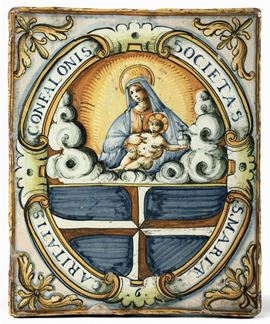 In un cartiglio ovale, con la scritta “CARITATIS CONFALONIS SOCIETAS S. MARIA”, nella parte superiore è dipinta la figura della Madonna e bambino sulle nuvole. Inferiormente troviamo una grande croce greca