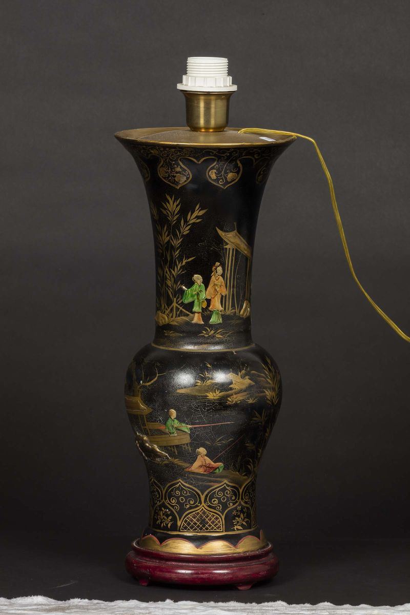 Il vaso, montato a lampada, ha il fondo color nero ed è decorato a cineserie, in policromia ed oro, con un paesaggio di riva con pagode e vari personaggi