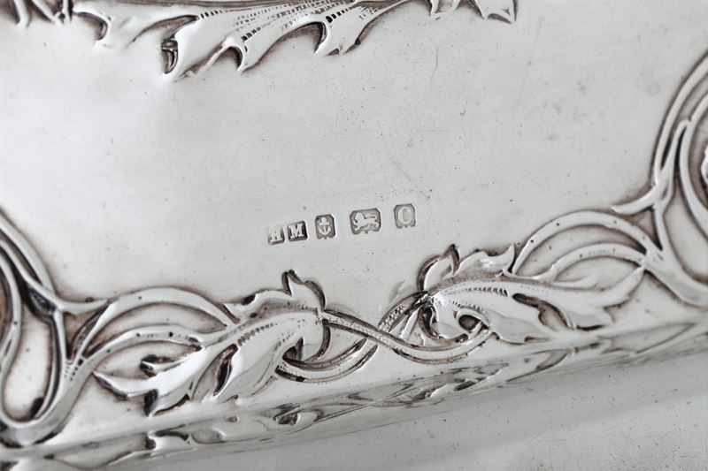 Vassoio in argento sterling cesellato, argentiere Alexander Clark, Inghilterra 1909-18