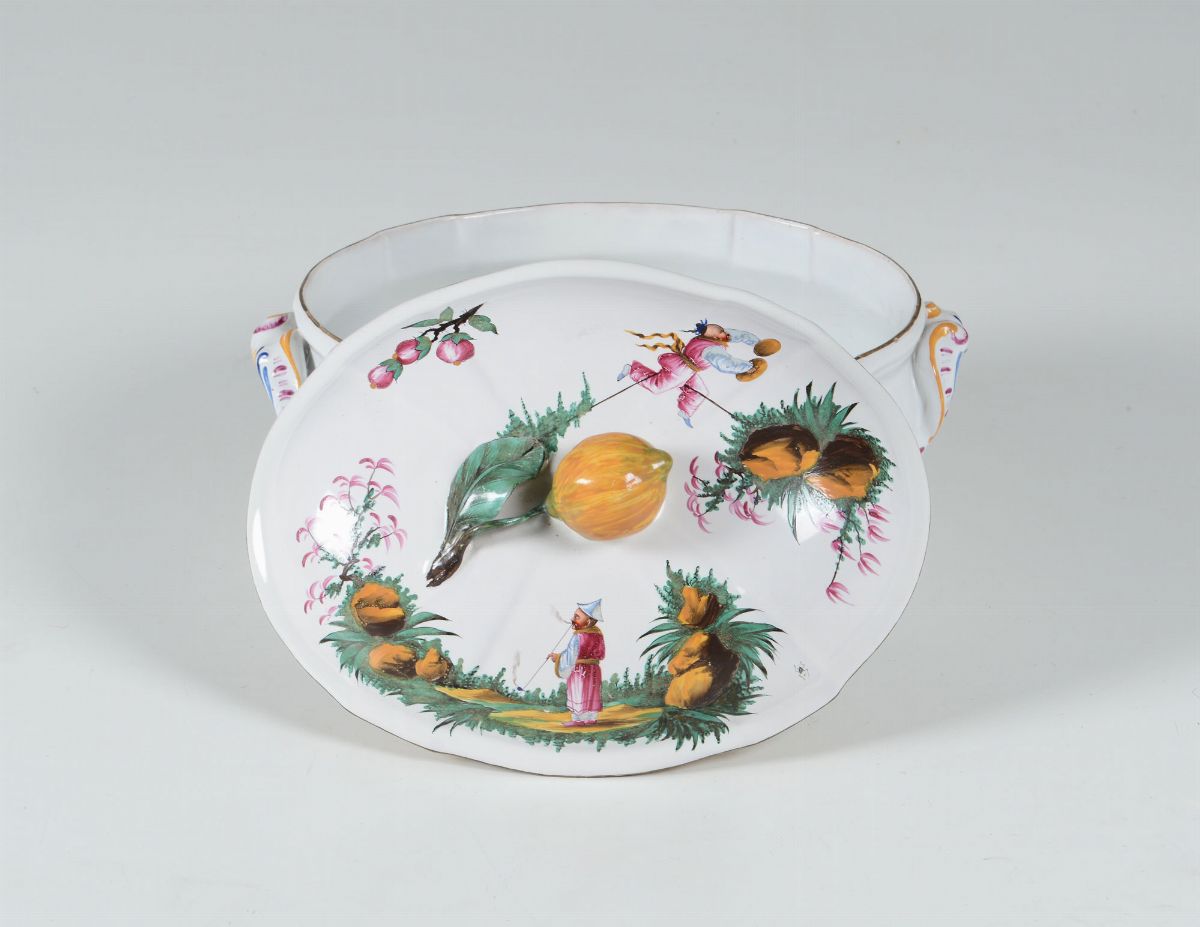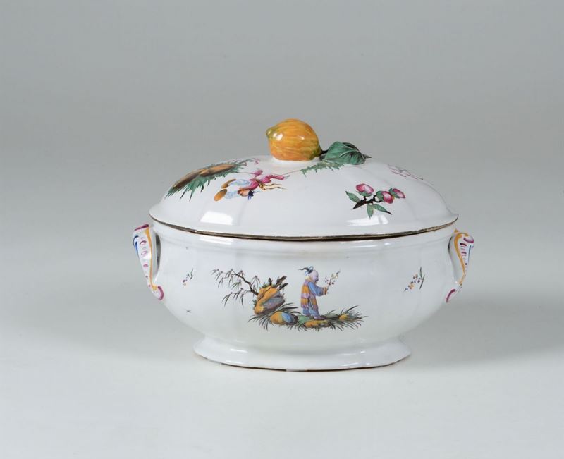 Il coperchio ha la presa a forma di limone con picciolo e foglia. La decorazione é a piccolo fuoco con delle scene con cinesi dipinti di profilo molto finemente e con colori particolarmente brillanti. Queste cineserie sono ispirate o riprese dalle incisioni del pittore francese Jean Pillement ed eseguite a Strasburgo con grande efficacia decorativa che emana vivace ed allegra spensieratezza