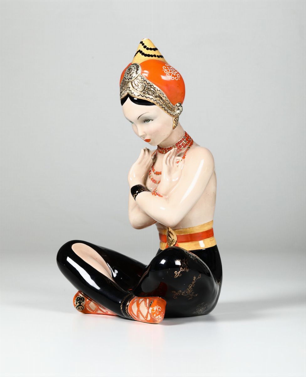 Figura di danzatrice orientale in terraglia a colaggio con decoro policromo.