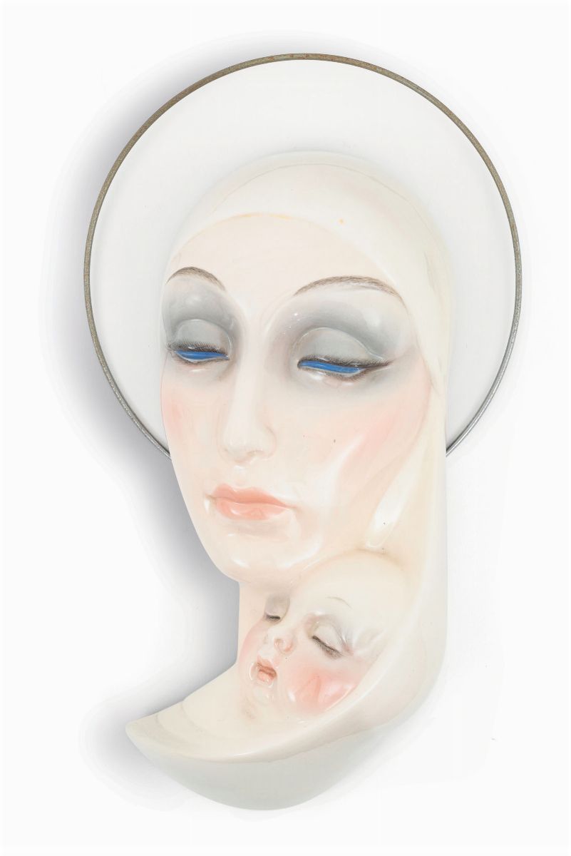 Volto di Madonna con Bambino in terraglia a colaggio con decori in policromia e aureola in metallo.