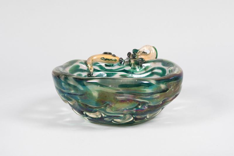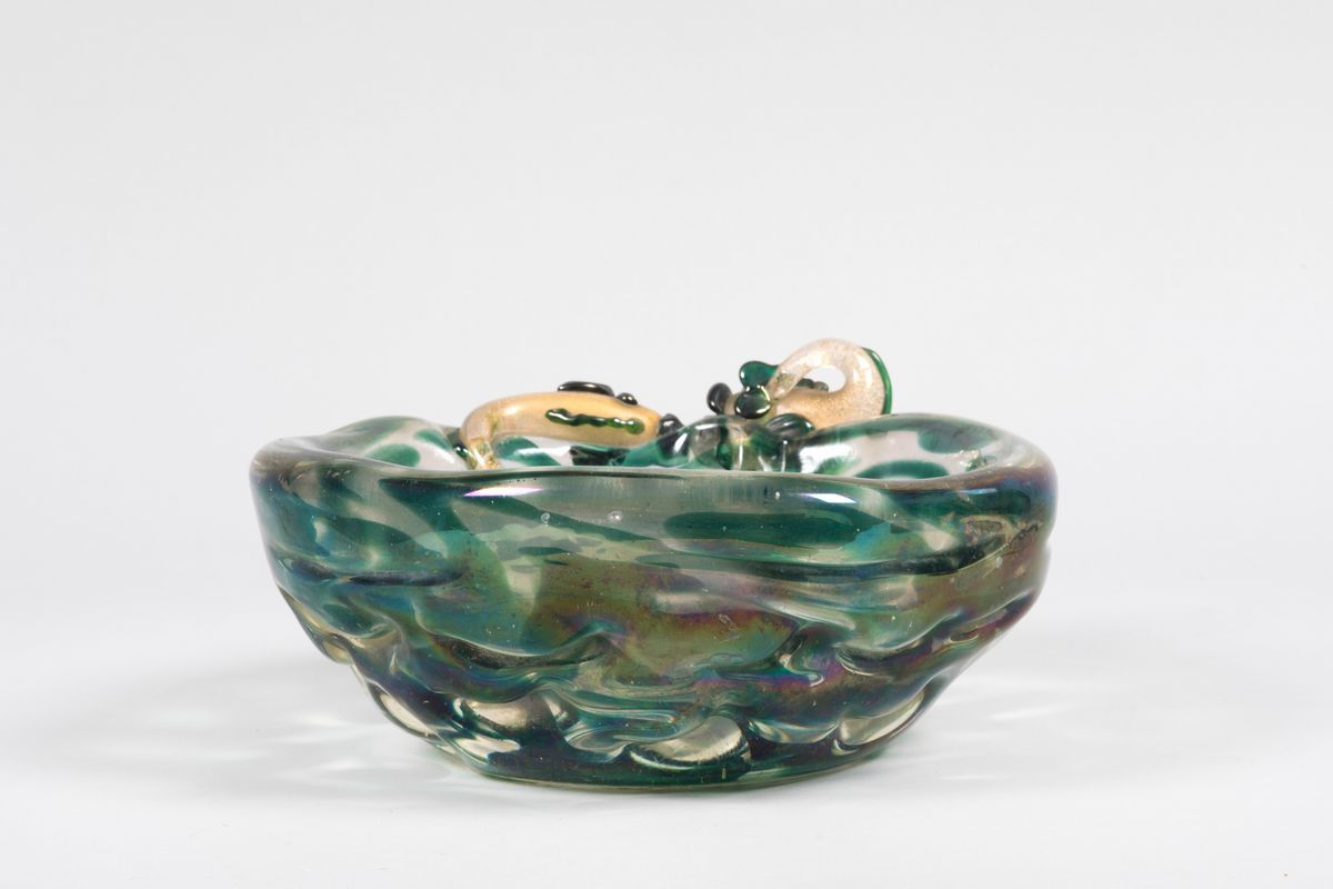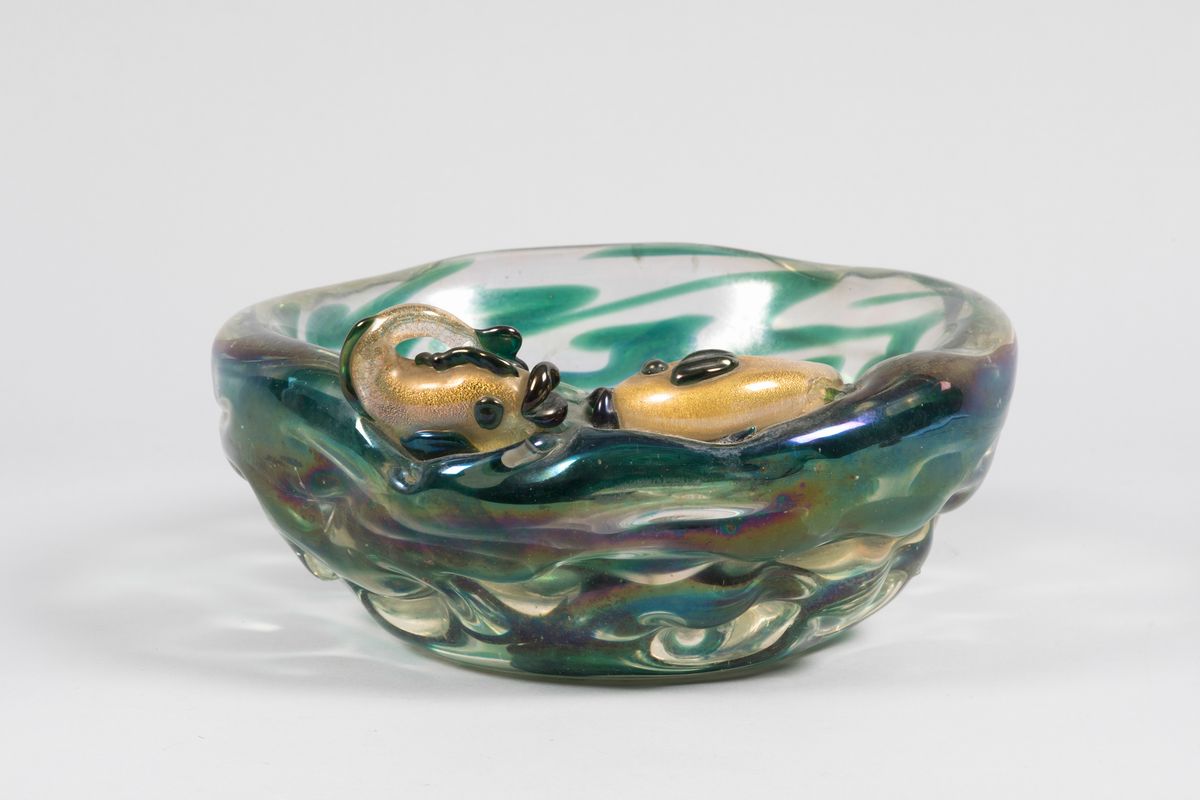 Grande ciotola in vetro pesante iridato con decoro astratto sommerso e coppia di pesci applicati con foglia oro.