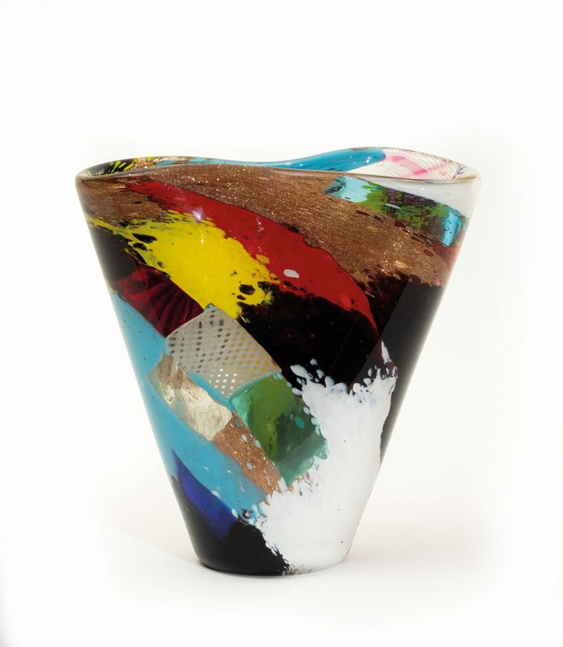 Vaso troncoconico ovale pinzato al centro serie Oriente in vetro soffiato con decoro a tessere policrome, canne zanfirico, avventurina e grande murrina a stella.