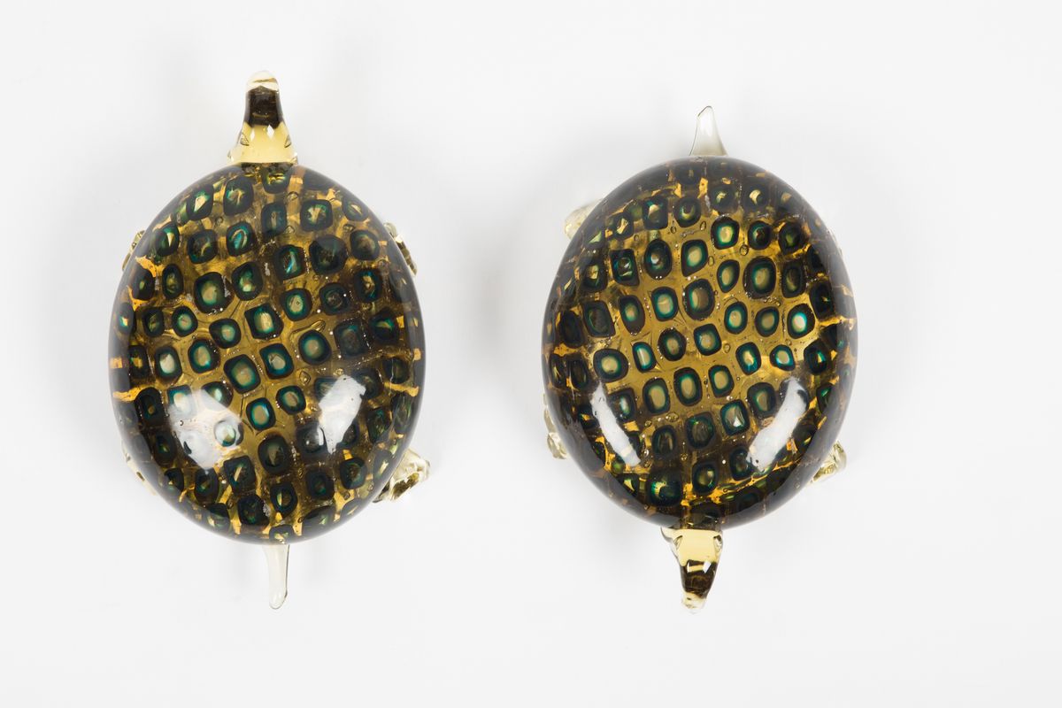 Coppia di tartarughe in vetro soffiato con decoro a murrine.