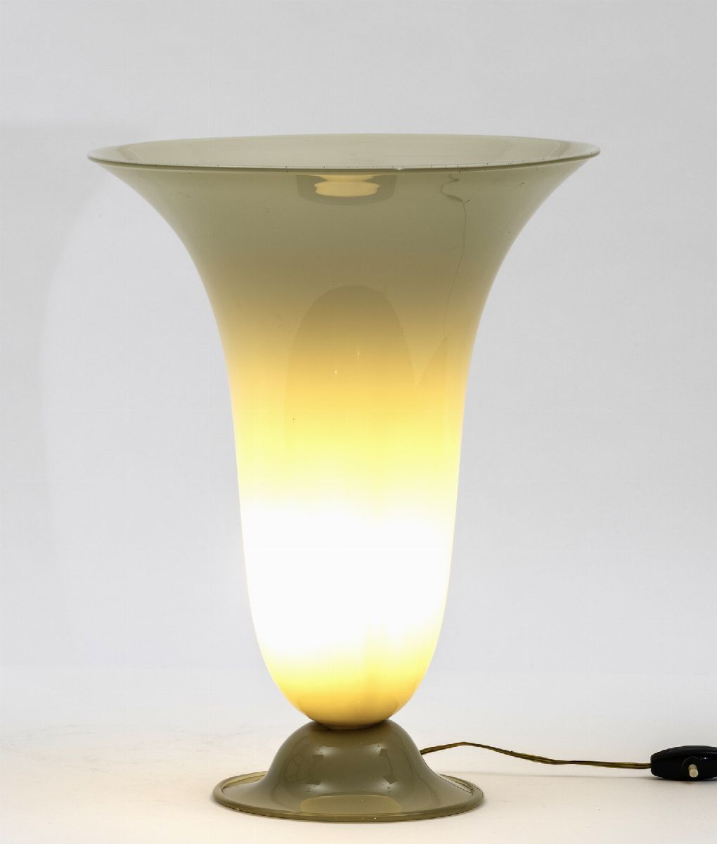 Lampada a campana in vetro opalino incamiciato. Vecchia etichetta cartacea